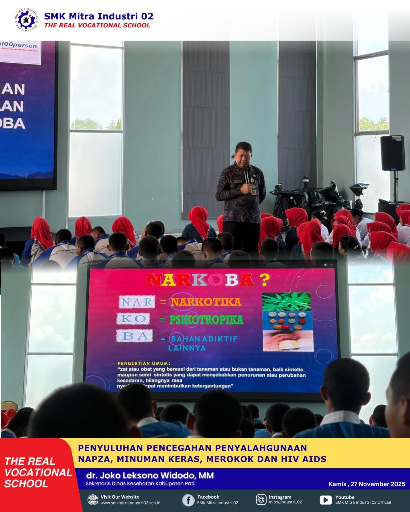 Pati, SMK Mitra Industri 02 SMK Mitra Industri 02 Pati mengadakan kegiatan penyuluhan mengenai bahaya narkoba, rokok, dan minuman keras pada Kamis (27/11/2025). Kegiatan yang berlangsung di aula sekolah ini diikuti oleh siswa kelas X, XI, dan XII.